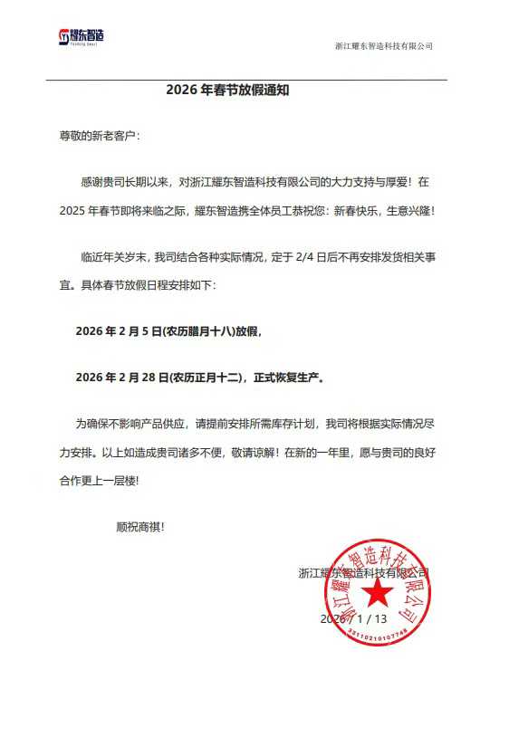 Duyuruya göre, ürün kalitesini ve tatil öncesi siparişlerin düzenli teslimatını sağlamak amacıyla Zhejiang Yaodong Smart Manufacturing'in üretim hatları 5 Şubat 2025'ten itibaren tamamen kapatılacak. Eş zamanlı olarak Bahar Şenliği tatili sırasında lojistik sevkiyatları da askıya alınacak. Şirket, son fırsat penceresini yakalayıp siparişlerini ve onaylarını mümkün olan en kısa sürede tamamlamaları için tüm yeni ve mevcut müşterilere envanter veya sipariş gereksinimleri konusunda acilen tavsiyelerde bulunuyor. Bu, şirketin kaynakları etkili bir şekilde yönetmesine ve son ürün partisinin tatilden önce zamanında ve kaliteli teslimatını sağlamasına olanak tanıyacak.